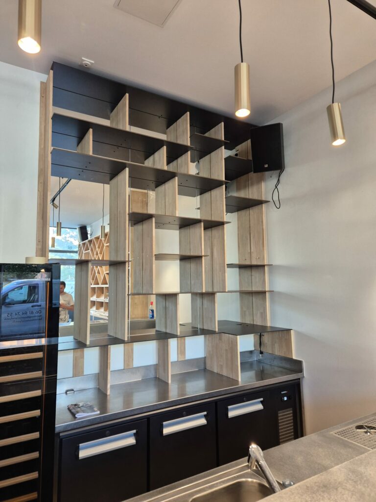• Des étagères de rangement derrière le bar, optimisées pour allier fonctionnalité et esthétisme, facilitant le travail quotidien.