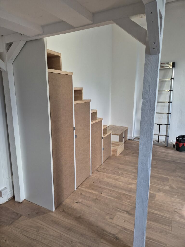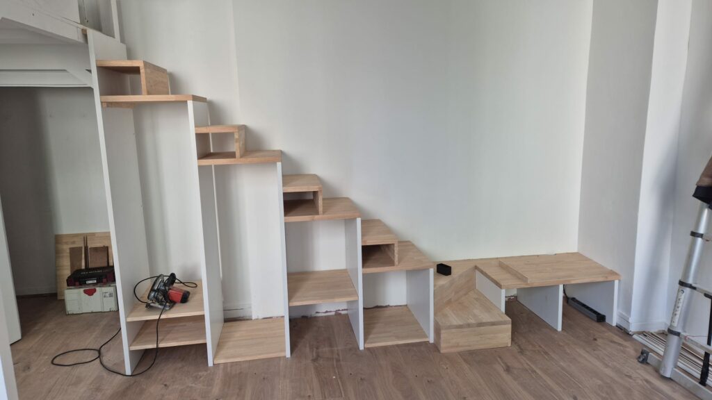 Dans le cadre de la rénovation d’un appartement typique croix-roussien, notre entreprise a conçu et réalisé un escalier sur mesure en bois, alliant esthétique, fonctionnalité et optimisation de l’espace.